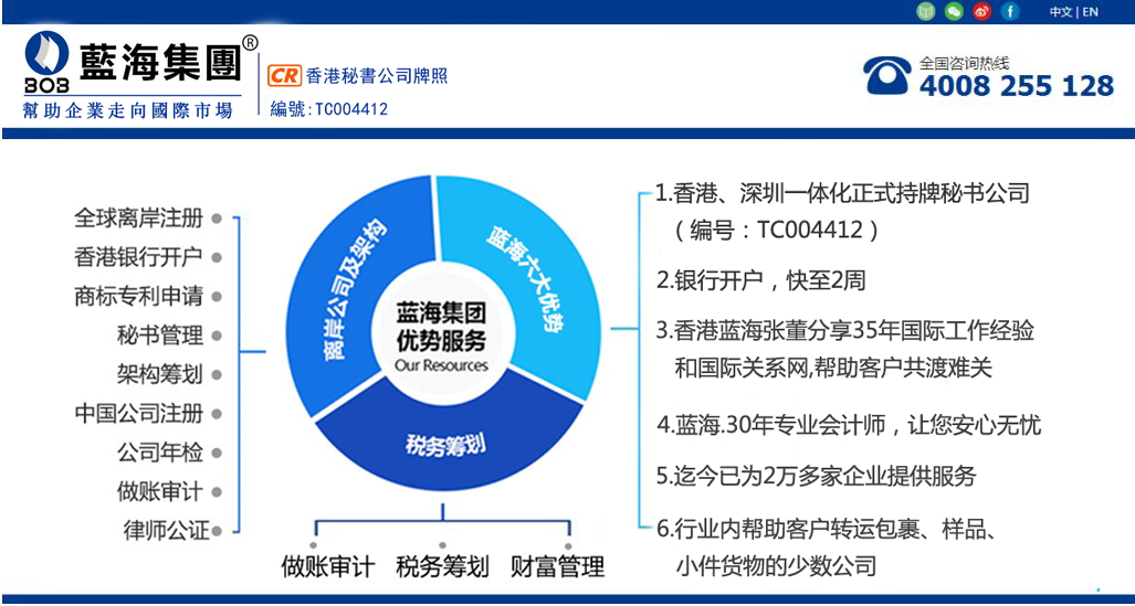藍(lán)海集團(tuán)成立13年來,專注于離岸公司注冊、銀行開戶、年檢、做賬審計報稅、商標(biāo)專利申請,海外融資及資產(chǎn)管理,企業(yè)海外經(jīng)營策劃,幫助中小微企業(yè)實(shí)現(xiàn)國際技術(shù)項(xiàng)目合作、股權(quán)買賣等一站式服務(wù)。