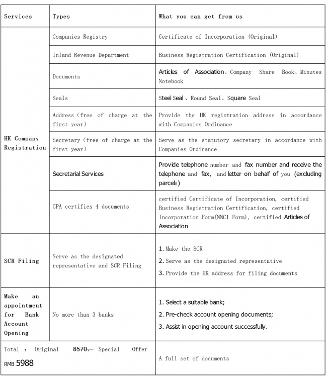 Hong Kong company registration+ SCR filing + arranging appointment for Hong Kong bank account opening fee list is as follows: (from March 1, 2018)